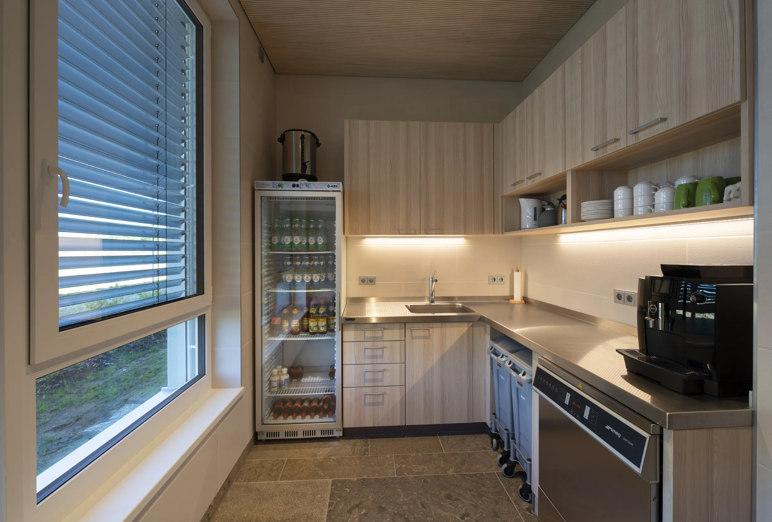 Ein besonderes Highlight unserer Seminarräume bei Kitzingen ist die praktische Küchenzeile bzw. Teeküche. Hier stehen Ihnen Geschirr, ein Kühlschrank und weitere Utensilien zur Verfügung. Damit es Ihren Teilnehmern an nichts fehlt, ist der Kühlschrank bereits mit alkoholfreien Getränken gefüllt. Zudem stehen Kaffee und Tee kostenlos bereit.